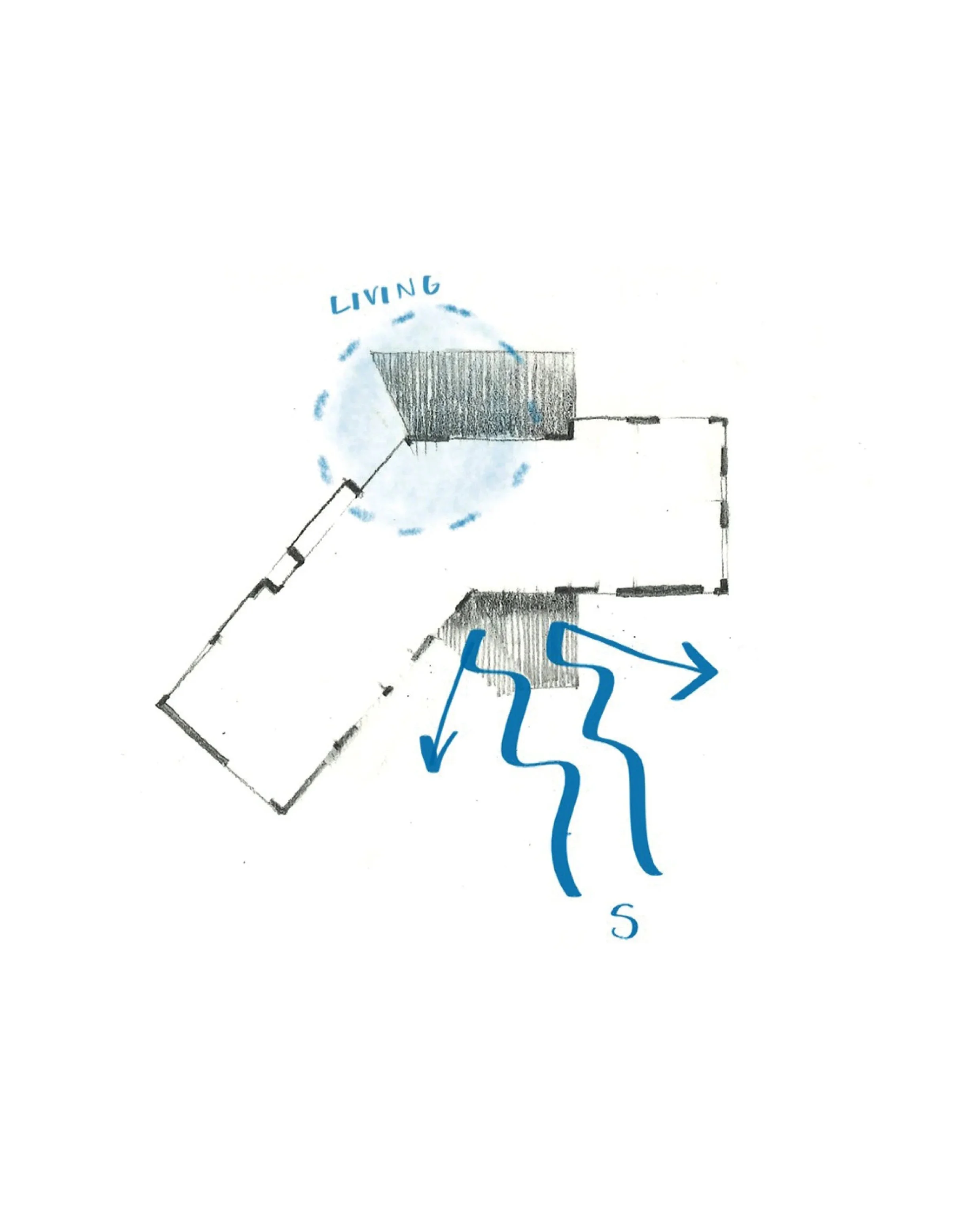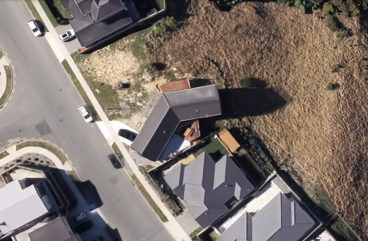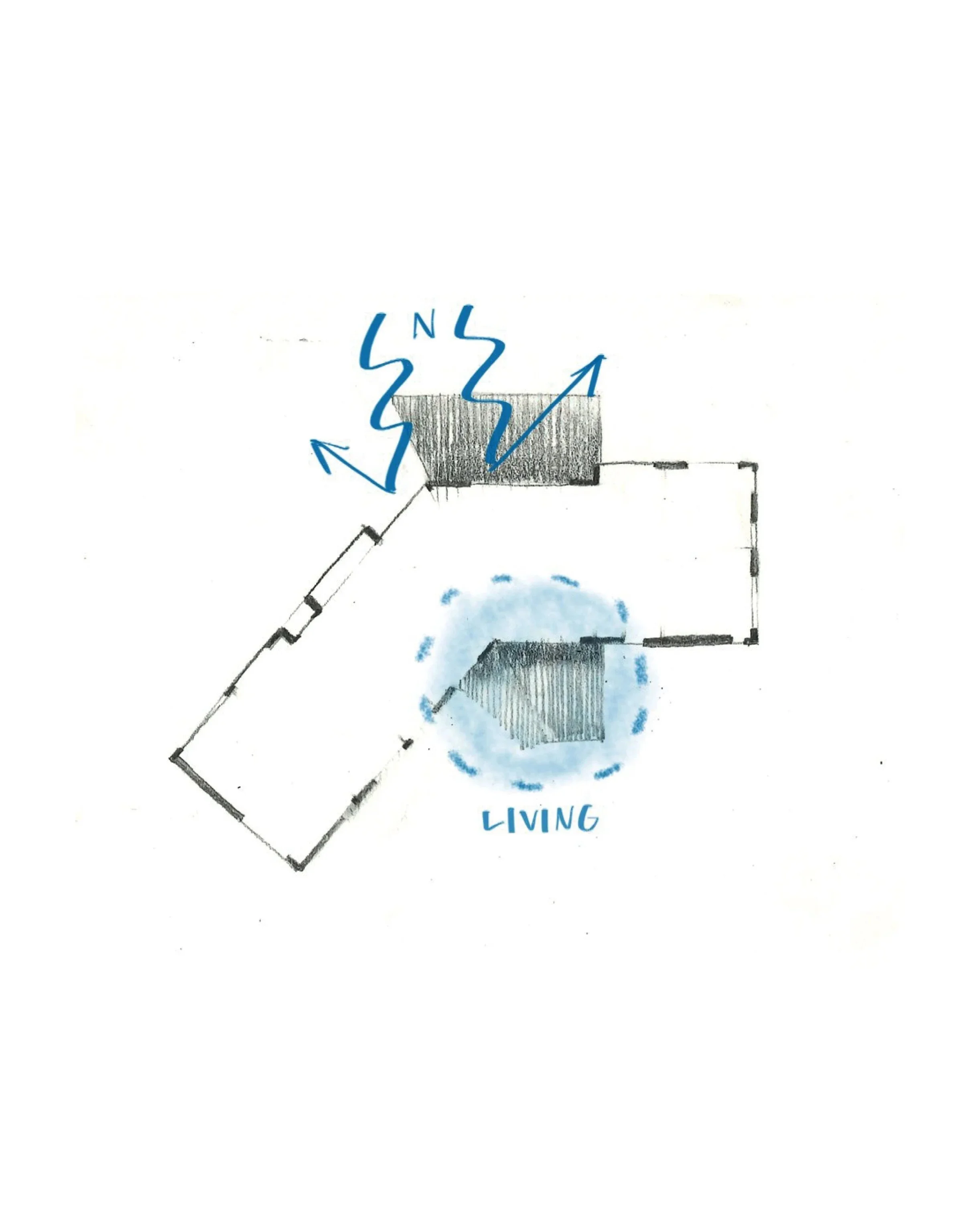 This house sits along a valley in Wellington’s northern suburbs where wind funnels strongly north and south. Our response was to shape the building footprint into an arrowhead aimed toward the prevailing northerly. Like the bow of a ship, the form cuts through the wind and deflects it around the building, creating a sheltered southern outdoor area that connects directly to the living spaces.