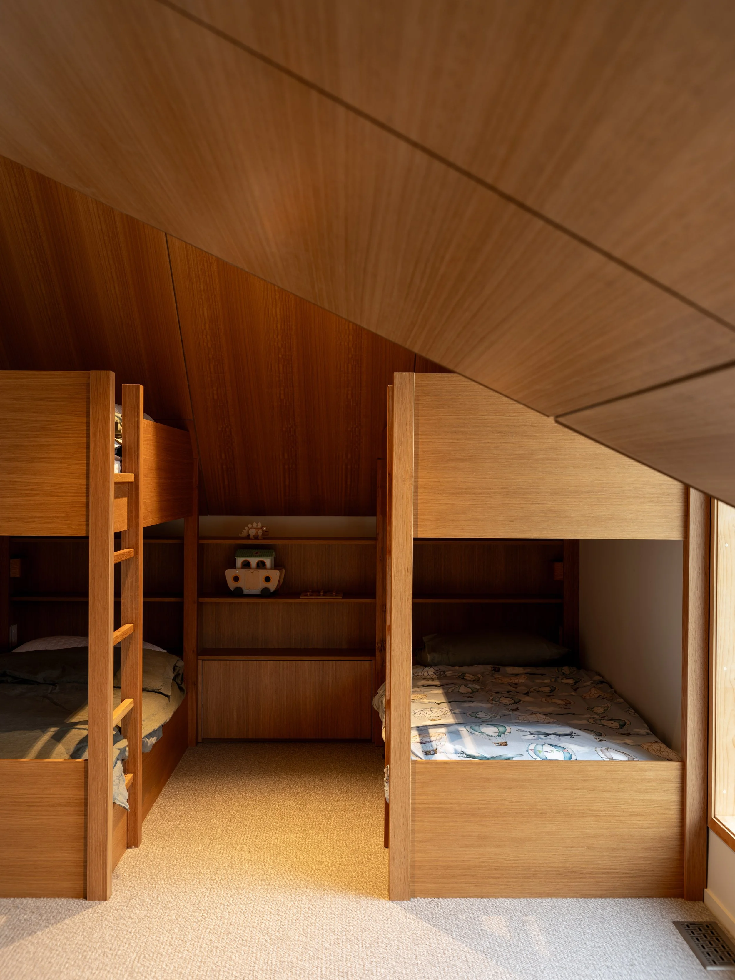 The design responds directly to its setting. Conceived as Three Peaks, the house is composed of distinct gabled volumes that reflect the surrounding mountain forms. Two glazed gables anchor the plan. One opens to a generous living space oriented toward panoramic views, while the other contains a layered bedroom wing. Between them, a folded roof element defines the threshold between shared and private realms. A stair and mezzanine bridge this space internally, connecting family life across levels while allowing retreat when needed.