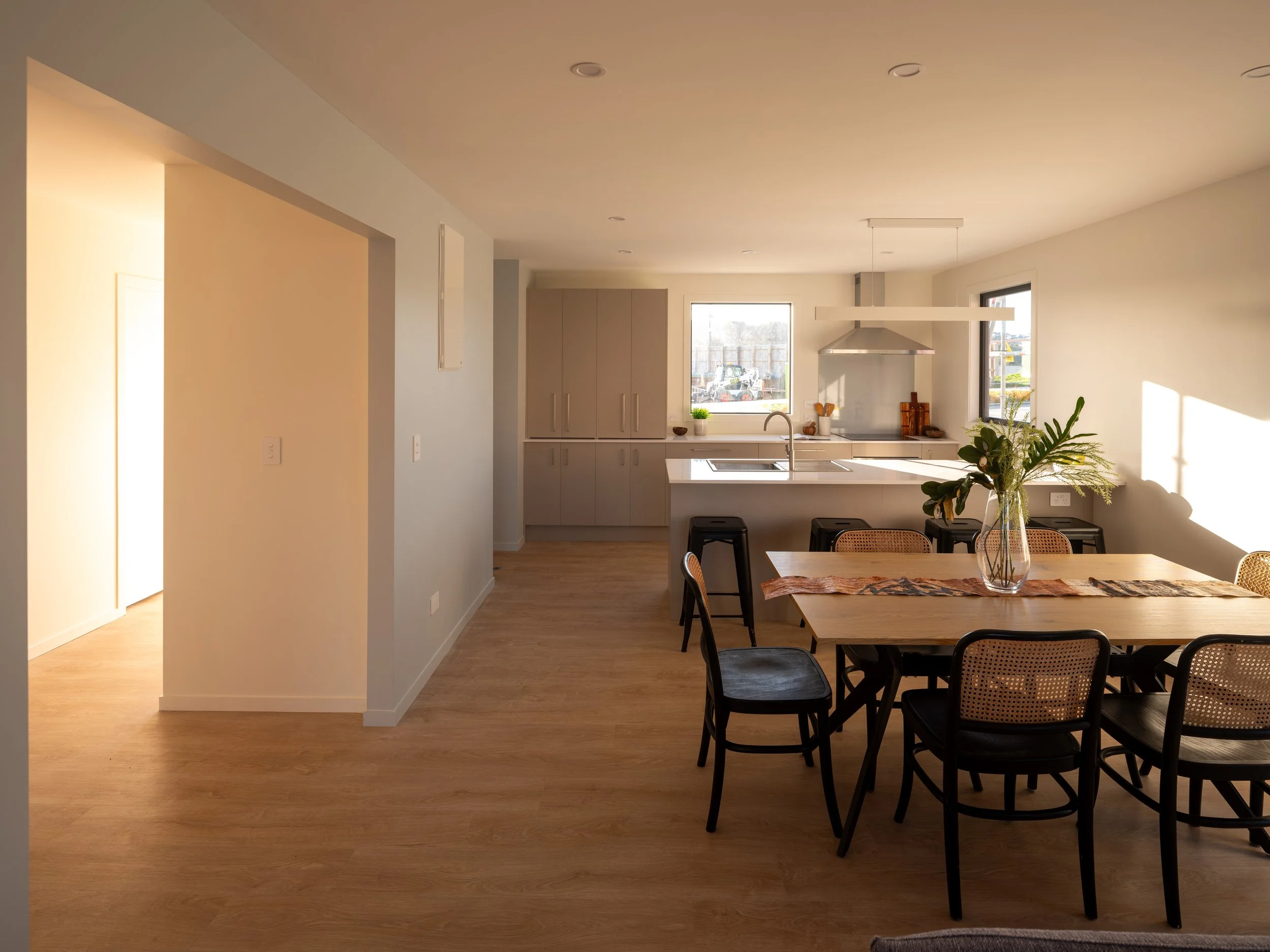 Material and construction decisions were driven by cost discipline and performance. Homes are timber framed with high insulation values, insulated slabs, continuous mechanical ventilation and low-emissive glazing, achieving Homestar 6. The large roof forms reference traditional Pacific fale while accommodating stacked density and providing privacy to upper-level bedrooms. Ground floor living spaces are intentionally flexible to support formal and informal gathering, intergenerational living and wider family events such as funerals and devotions.